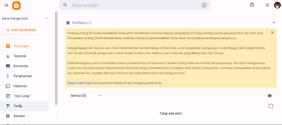Gambar diatas menandakan kita sudah mempunyasi sebuah blog tapi kita belum ada postingan sama sekali> Ini langkah awal cara membuat blog baca manga